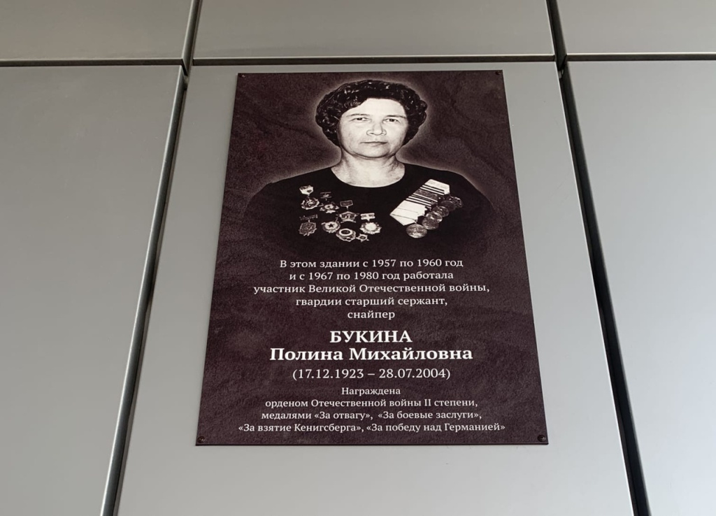 На здании спортивного комплекса «Шахтер» установлена мемориальная доска для увековечивания памяти об участнике Великой Отечественной войны Полине Михайловне Букиной.